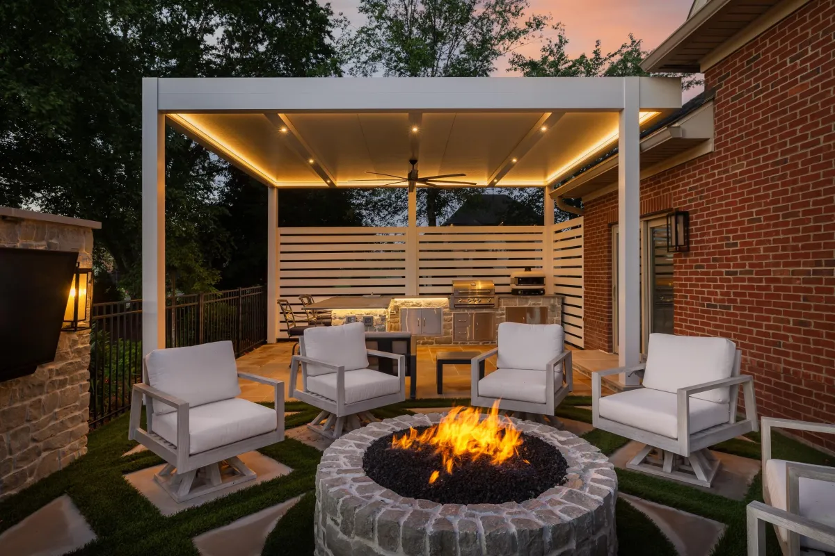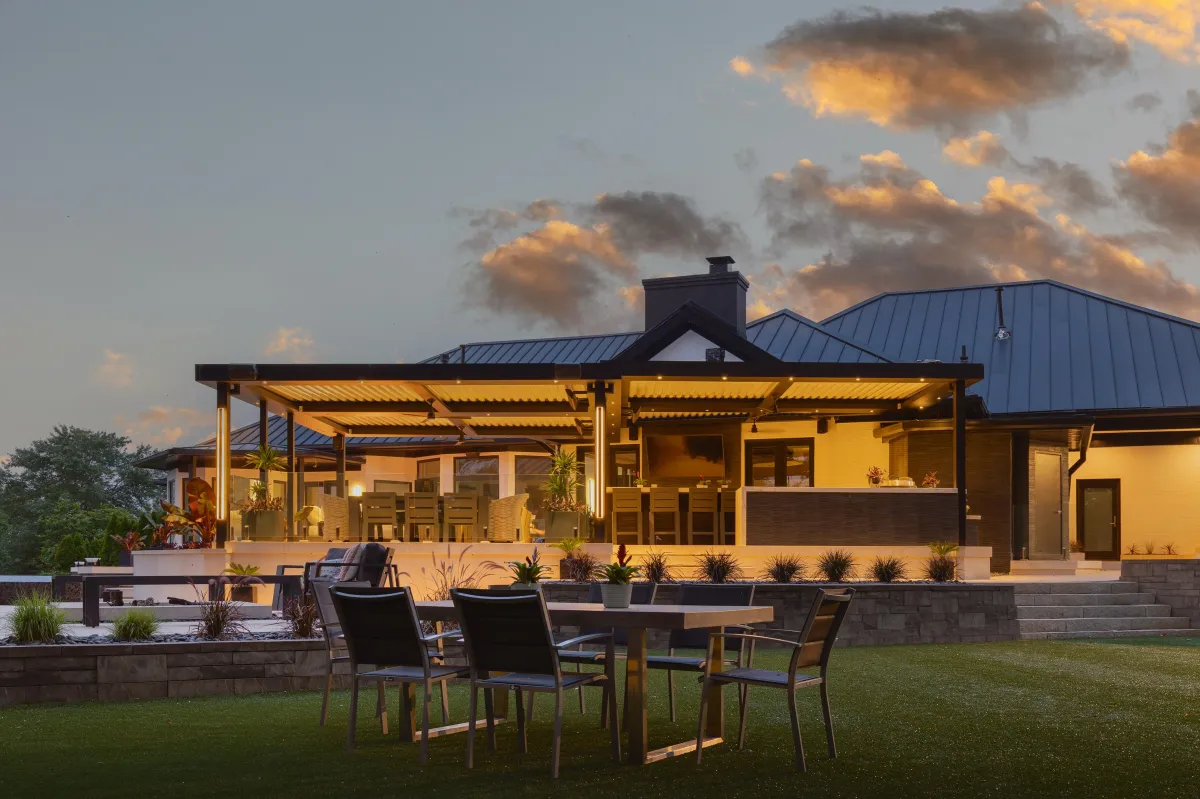 Motorized pergola with weather sensors, LED lighting, and an outdoor kitchen.